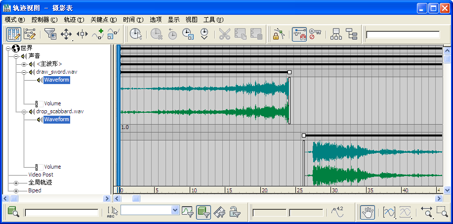 ProSound 是适用于 3ds Max 的实时多轨音频解决方案,完全支持“轨迹视图”并集成在“轨迹视图”中。为获得最佳效果,请在“摄影表”模式下使用“轨迹视图”。