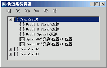 “轨迹集编辑器”对话框是一种无模式对话框,可以用来创建和编辑名为轨迹集的动画轨迹组。这功能便于同时使用多个轨迹,这是因为无需分别选择各个轨迹即可对其进行重新调用。