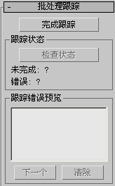 如果设置跟踪器,可以使用“摄影机跟踪器”工具的“批量跟踪”卷展栏来执行不干涉功能的跟踪。您可以设置一组跟踪器,开始对所有这些跟踪器进行批量跟踪,然后使用该面板中的其他工具来检查和审阅检测到的跟踪错误。此面板还可以检查跟踪完成情况。