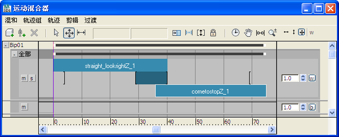 与运动流非常类似,在混合器中,基于脚的运动剪辑(IK 约束使脚在不同的时间内限制在一定位置的剪辑)之间的变换必须小心放置和调整,以使动画看上去更自然。工作流程取决于是正在设置 Biped 还是 3ds Max 对象(如装备的角色)的动画。
