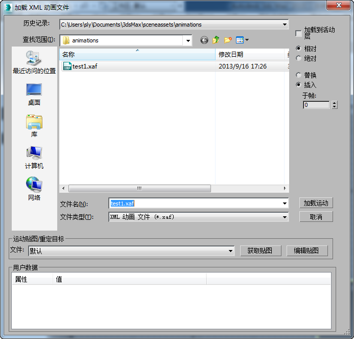“用户数据”列表显示在“文件名”字段中指定的 XAF 文件中的任何用户数据。可以通过“保存动画”对话框,或通过直接编辑 XAF 文件创建用户数据。