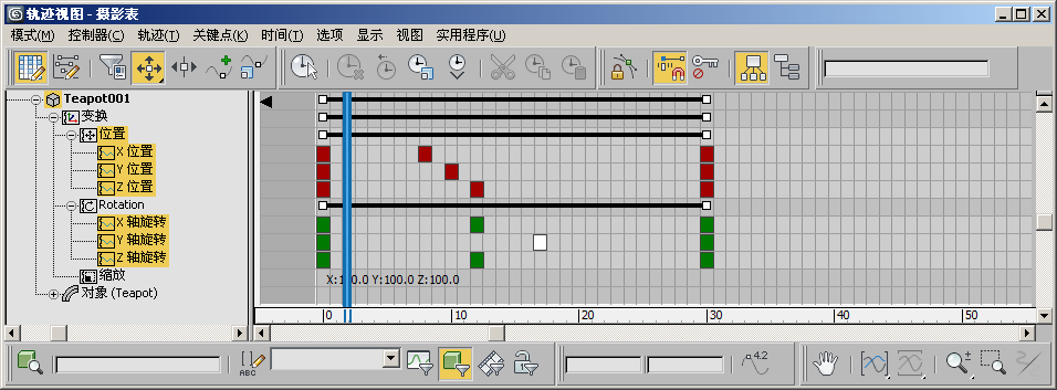 “摄影表”编辑器使用“轨迹视图”来在水平图形上显示随时间变化的动画关键点。这以图形的方式显示调整动画计时的简化操作,因为可以在一个类似电子表格中看到所有的关键点。“轨迹视图”的另外一种模式是曲线编辑器,在曲线编辑器中,除了可以处理关键点以外,还可以处理插值曲线。