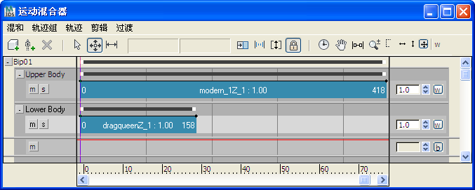 当在两足动物的上半身和下半身使用不同的运动时,您可以创造这样一个环境:两个剪辑中的平衡彼此不匹配。例如,如果上半身使用的动画中手臂大幅度摇摆,那么应该补偿一定程序的臀部动画,以保持 Biped 平衡。这种手臂运动与其他臀部/腿部运动的直接混合最有可能造成平衡失调。