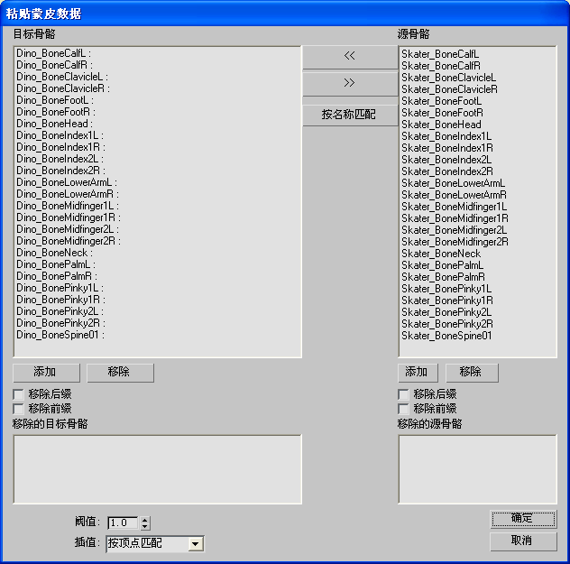 将源骨骼和目标骨骼按名称匹配。如果已经移除前缀和后缀以使所显示的源骨骼和目标骨骼精确匹配,则可使用此选项。