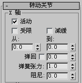 “滑动关节”卷展栏和“转动关节”卷展栏分别对应于位置和旋转,含有类似的控件。另外,每个卷展栏包含有相同的组框,来控制 X、Y 和 Z 轴。