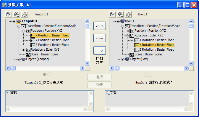 当所选参数之间存在已有关联时启用“断开”按钮。此操作会移除关联控制器并用主参数的动画轨迹(如果为双向)或用默认的控制器(如果为单向)替代它们。