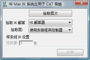 借助“应用 Max IK”工具,您可以使用 3ds Max IK 系统设置 CATRig 动画。可以使用样条线控制很长的尾部,或使用数字 HI/IK 为角色的手指和脚趾提供 IK 控件。