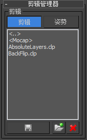 “剪辑/姿势管理器”提供了用于保存和加载动画剪辑与姿势的控件。可以使用“剪辑”和“姿势”按钮在“剪辑管理器”和“姿势管理器”之间进行切换(卷展栏的名称始终是“剪辑管理器”)。