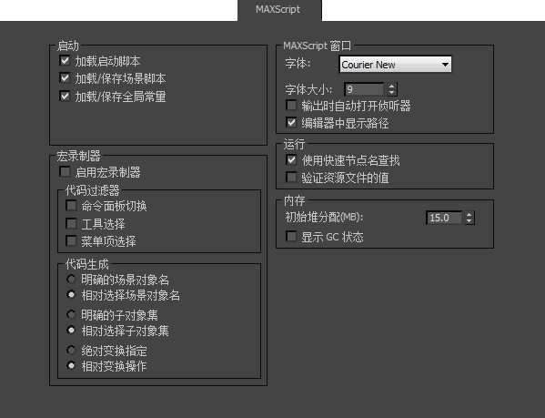在“首选项设置”对话框的 MAXScript 面板上,可以设置“MAXScript”和“宏录制器”首选项,启用或禁用自动加载脚本”设置初始堆大小,更改 MAXScript 编辑器使用的字体样式和字体大小,并管理“宏录制器”的所有设置。
