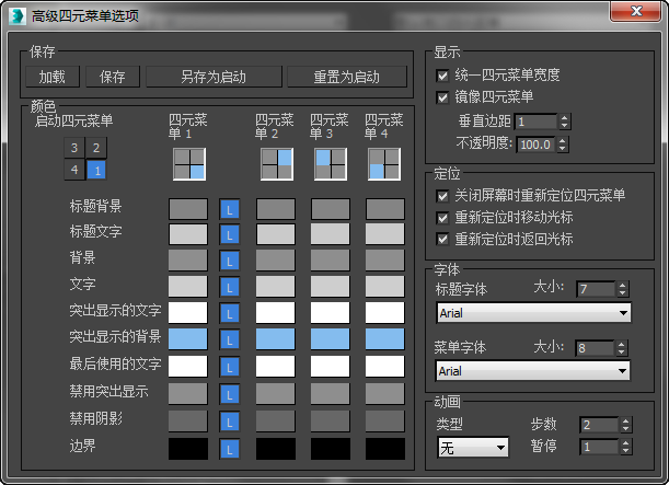 使用“高级四元菜单选项”对话框可以自定义四元菜单的大小和颜色。也可以自定义其他四元菜单的行为,如重新定位、输入字体和光标行为。