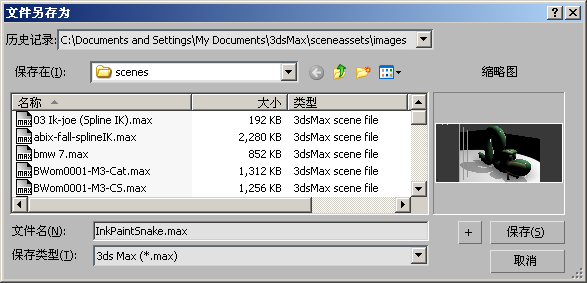 “文件另存为”对话框具有标准的 Windows 文件保存控件。右边的缩略图区域显示场景预览,该场景的文件名在左边的列表中高亮显示。