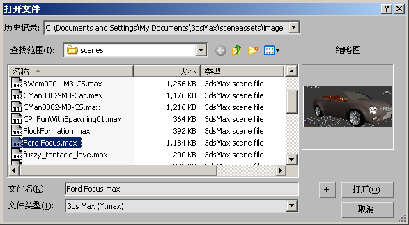 “打开文件”对话框具有标准的 Windows 文件打开控件。右边的缩略图区域显示场景预览,该场景的文件名在左边的列表中高亮显示。