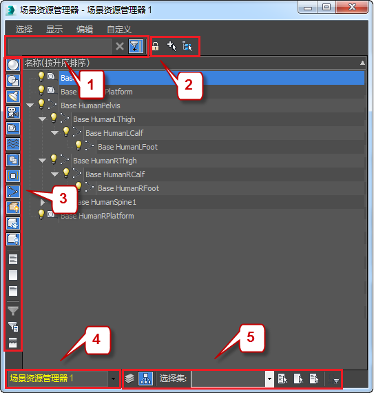 启用时,该工具栏会垂直放置在“场景资源管理器”窗口的左侧。其按钮允许您选择显示在“场景资源管理器”列表中的对象类型。过滤器按钮处于启用状态(高亮显示背景)时,其对象类型将显示在列表中;处于禁用状态(灰色背景)时,“场景资源管理器”将不会列出该对象类型。