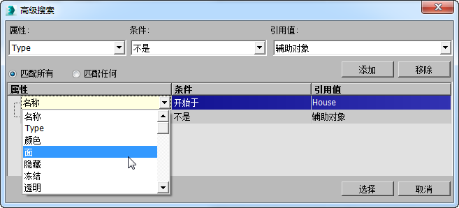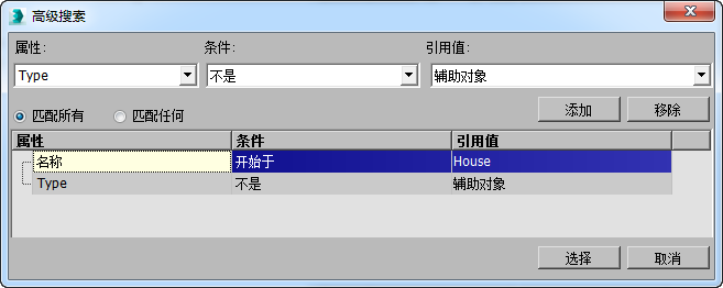 例如,如果要仅显示辅助对象以外的名称以“House”开始的对象,可以执行如下的搜索: