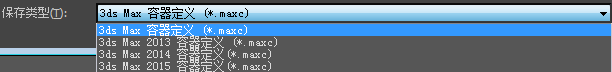 在文件对话框中,您可以使用“保存类型”下拉列表保存为早期版本的 3ds Max 格式,即恢复为“3ds Max 2013 容器定义(*.maxc)”。