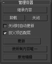 “管理容器”卷展栏用于在场景中打开、关闭、继承、保存和更新容器。也可以用于将源容器转化为唯一容器。