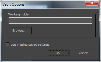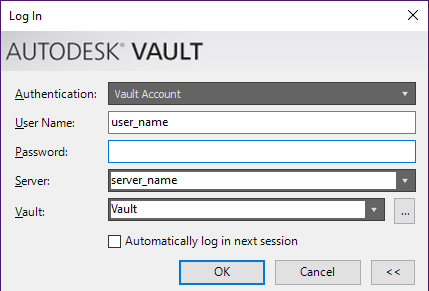 显示“Vault 登录”对话框。输入您的身份验证、用户名、密码、服务器名称和 Vault 名称,然后单击“确定”。输入服务器名称之后,可以单击省略号 (...) 按钮以显示所有可用的数据库,并从对话框中进行选择。