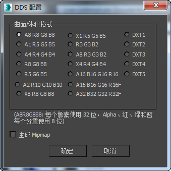 DirectDraw(R) Surface (DDS) 文件格式用于存储具有和不具有 mipmap 级别的纹理和立方体环境贴图。此格式可以存储未压缩的像素格式和压缩的像素格式,并且是存储 DXTn 压缩数据的首选文件格式。此文件格式的开发商是 Microsoft®。