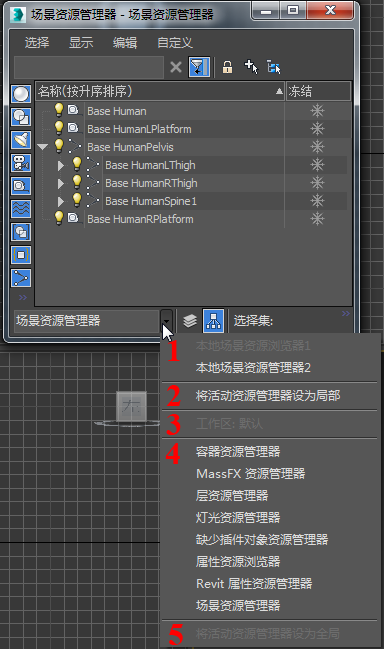 该图显示了标准、浮动、全局场景资源管理器,其通过默认工作空间中“工具”菜单上打开的场景资源管理器调用(为了明确起见,添加了红色编号)。此“场景资源管理器”对话框处于活动状态,由它的名称“场景资源管理器”(下拉列表左侧的黄色文本)指示。