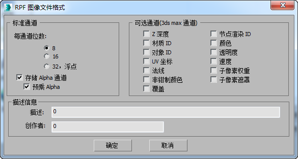 RPF(Rich Pixel 格式)是一种支持包含任意图像通道能力的格式。设置用于输出的文件时,如果从列表中选择“RPF 图像文件”,那么会进入“RPF 设置”对话框。可以在该对话框中指定写出到文件中所使用的通道类型。