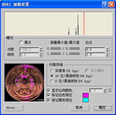 - 在“HDRI 加载设置”对话框中,注意“测量最小值/最大值”以查看图像的亮度范围。