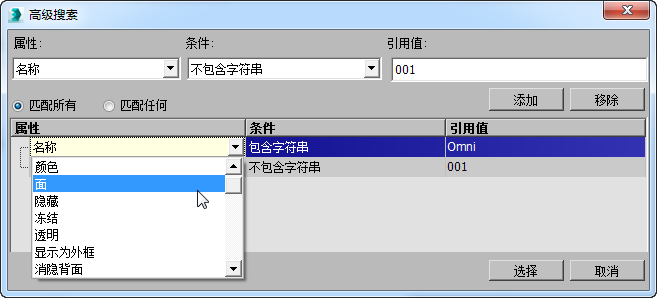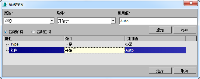 “高级搜索”对话框允许通过使用指定布尔搜索的搜索短语在“场景资源管理器”列表中高亮显示对象。例如,您可以使用高级搜索仅选择具有特定颜色、名称以“S”起始的、隐藏的非几何体对象。
