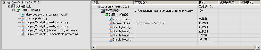 也可根据需要为每个资源显示图标,其中显示资源类型(3ds Max 场景文件、贴图分支等)和状态。大多数状态图标都在“Vault 资源管理器帮助”