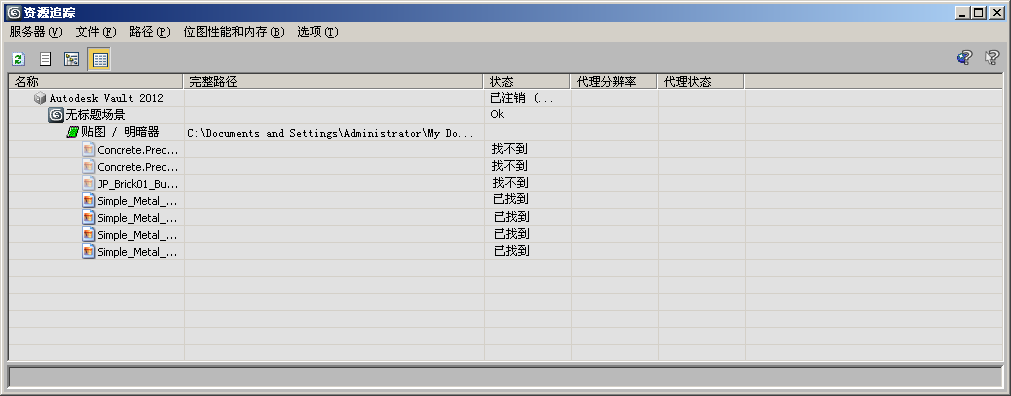 根据当前的设置,“资源跟踪”对话框窗口以树视图或表视图的方式列出当前场景的所有资源。所列出的资源包括场景文件、材质中场景所使用的所有图像等、外部参照和光学度文件。默认情况下,如渲染图像等输出文件也出现在窗口列表中;如果需要,可以禁用这些文件的显示。
