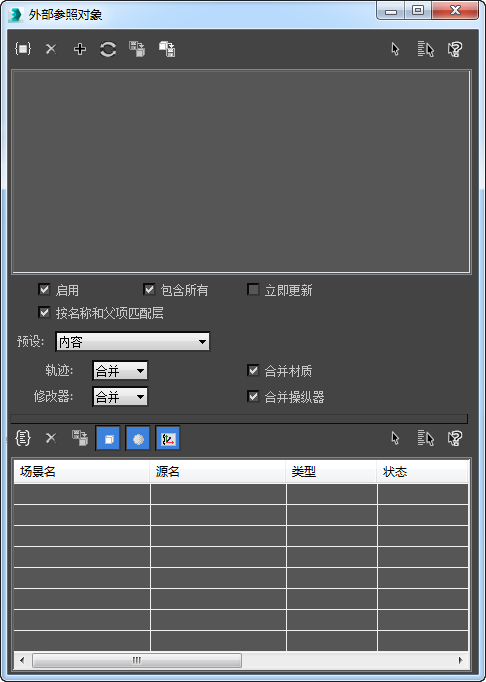 “外部参照对象”对话框分为位于顶部的“外部参照记录”和位于底部的“外部参照实体”两部分。“外部参照对象”对话框提供了用于添加和删除外部参照对象、控制器和材质的控件。