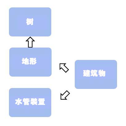 上个例子不太实用。假定您想隐藏部分场景,以使外部参照该场景的其他设计人员不会看到它。例如,您正在处理一个建筑物,并外部参照了列出该建筑物的水管装置的 CAD 文件,以及一个包含外部参照一些树的地面地形场景。外部参照场景图形看起来如下所示: