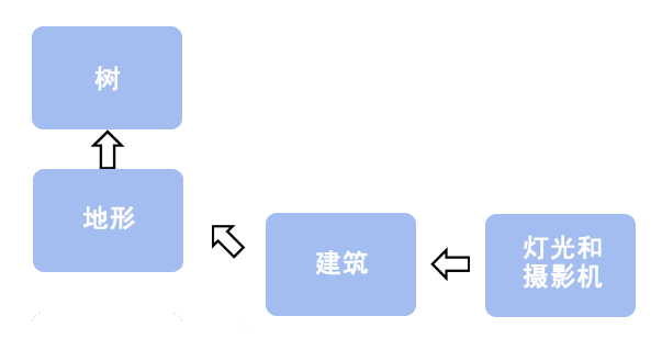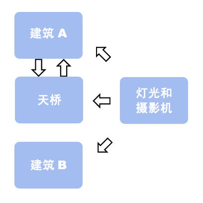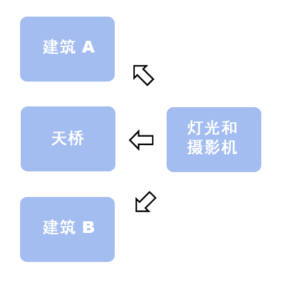 在这种情况下,叠加仅用于对其他主场景隐藏数据信息。叠加的另一个用途是避免循环外部参照。例如,描绘处理一个城市街区场景的 4 名设计人员。有两个设计人员在处理单个的建筑物,一个设计人员在处理连接两座建筑物的天桥,另外一位设计人员在设置摄影机和照明。外部参照场景图形看起来如下所示: