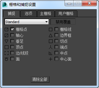 默认情况下,将会打开该对话框,其“捕捉”面板中的“标准”类别处于活动状态,且“栅格点”选项处于启用状态。
