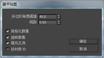 程序贴图的展平贴图方法将平面贴图应用于落入指定角度阈值中的连续纹理多边形组。可避免贴图簇的重叠,但是仍会导致纹理扭曲。使用“展平贴图”对话框可以控制簇进行贴图和定义的方式。