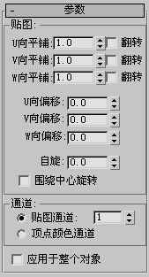 可以指定是否将变换应用于贴图通道或顶点颜色通道,以及使用哪个通道。关于这些通道的更多信息,请参见UVW 贴图修改器。