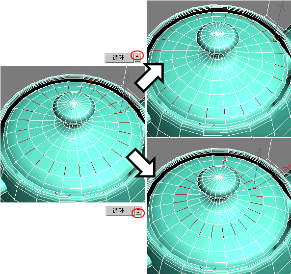 - “环形”按钮旁边的微调器允许您在任意方向将选择移动到相同环上的其他边,即相邻的平行边。如果您选择了循环,则可以使用该功能选择相邻的循环。只适用于“边”和“边界”子对象层级。