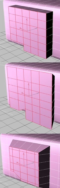 在“编辑多边形”(多边形)子对象层级,可选择单个或多个多边形,然后使用标准方法变换它们。这与“元素”子对象层级相似;有关多边形与元素的区别,请参见“编辑多边形”