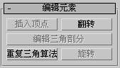 在“元素”子对象层级,该卷展栏包含常见的多边形和元素命令。在“多边形”层级,它包含这些命令和多边形特有的多个命令。在这两个层级都可用的命令包括:“插入顶点”、“翻转”、“编辑三角剖分”、“重复三角算法”和“转变”。