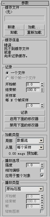从磁盘上的缓存文件中加载顶点动画到“点缓存”修改器中。如果缓存中的顶点数与对象中的顶点数不匹配,则“缓存信息”组报告错误,并且动画不生效。