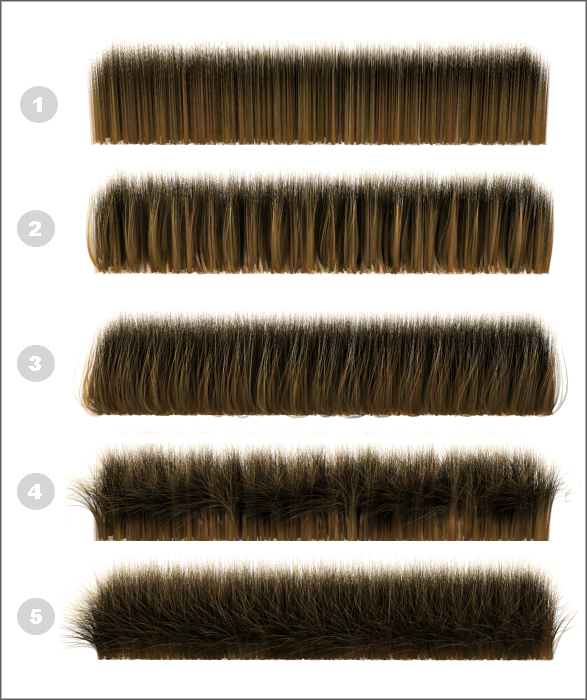 左:不同的卷发根和卷发梢值生成的弯曲毛发。