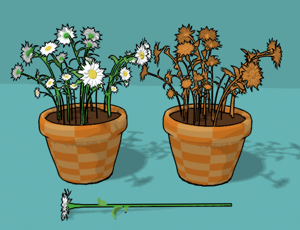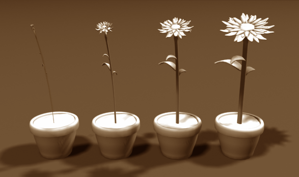 下一图示显示“合并材质”复选框的效果。左侧的“合并材质”为开,其结果为花的模型在用作毛发的时候保持其初始材质和颜色。右侧的“合并材质”为关闭,因此花式毛发采用了花盆生长对象的材质。