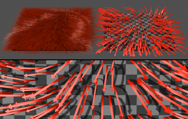 以下的最后一幅插图,显示了实例化毛发如何将自身与导向一致对齐,无论导向采用什么样式。样式化的毛发从中央绘制,示例在各个方向完美对齐,没有纽结或其他扭曲。例如,这便于其将实例设计为缩放样式。