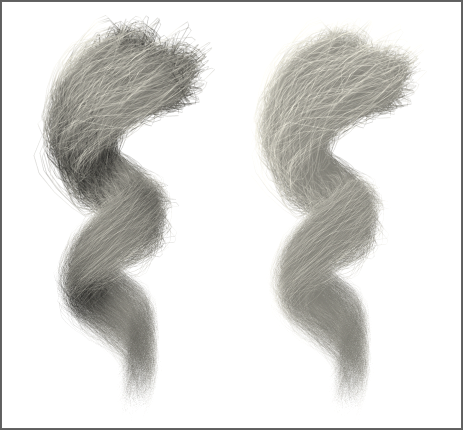 Hair 令毛发亮度变化的量。默认值可以产生看起来比较自然的毛发。默认值为 50.0。范围为 0.0 至 100.0。
