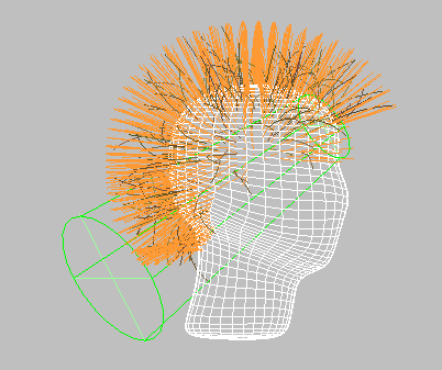 每个导向毛发有 15 段和 14 个顶点(根部有一个附加的不可选顶点),对于影响导向的工具,必须至少选择一个顶点。要选择顶点,请单击“选择”(位于“设计”组中)将其启用,然后使用标准的 3ds Max 选择工具选择部分导向。例如,可以拖动选择矩形选择相邻头发导向中的顶点。默认情况下,选定导向显示为橙色,而未选择的导向显示如下。