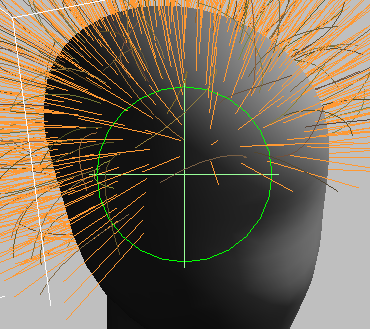启用“头发笔刷”时,笔刷 gizmo 会显示在视口中。在活动视口中,笔刷显示为圆形,但正如您在其他视口中所见的一样,笔刷实际上是三维圆柱形区域。
