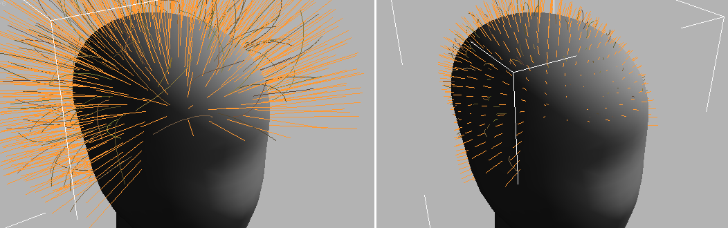 右:使用“站立”工具设计发型之后导向头发(位于右侧)