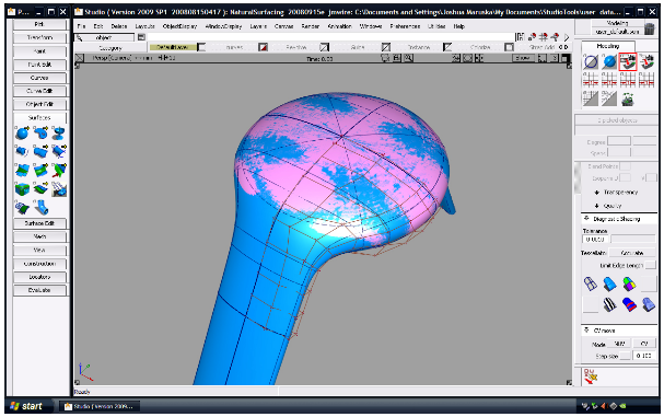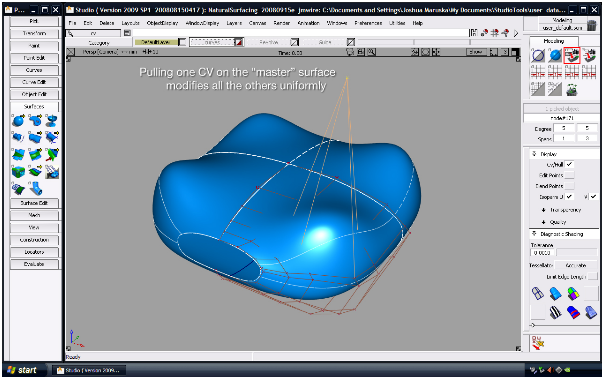 I hope this shows some of the advantages of working with this method of surface development. If this model had been constructed using several surfaces knitted together with little blends and transitions, it would have been very time consuming to make a broad sweeping change like this.