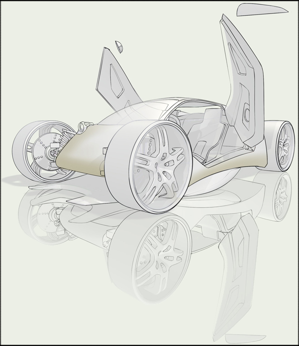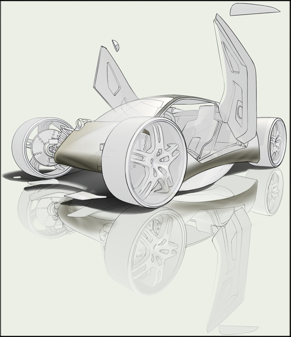 I add a new layer over the capture and flood fill with White. After pulling down the opacity so that I can see the sketch beneath, I add a new layer to begin the sketch. This is where I could start using the lines of the model to snap my pencil to, had I been using an overlay canvas.) However, I use freehand lines and predictive strokes to get the initial line drawing out. I've built up the door panels and interior as I didn't get around to modeling it before the sketch. I also added a small insect-like headlamp to the front end. This is a process of creating layer after layer to avoid erasing or drawing over completed line work. Once the sketch is completed, I merged all the layers, except for the bottom two.