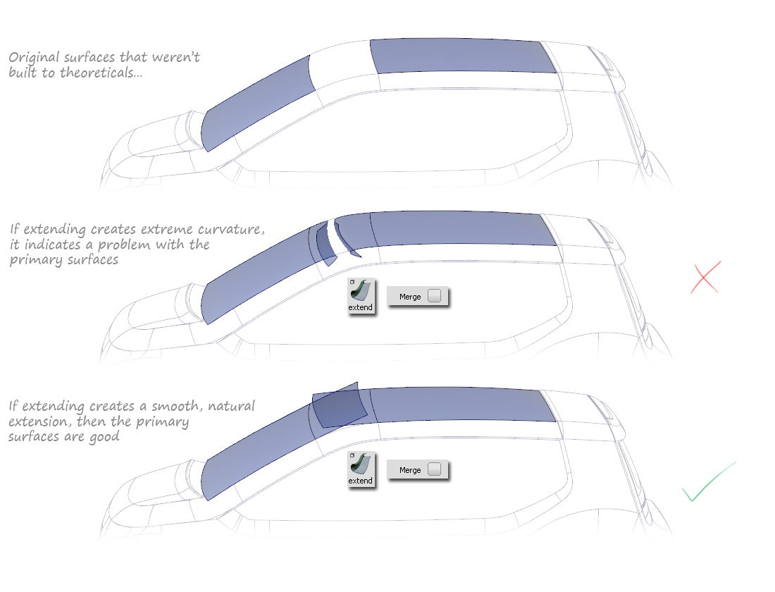 Working to theoreticals is a natural part of the sketching process. We do it to get a strong, taut line. If we tried to draw the main shapes and blends in one pencil stroke, the line would be less confident and have less tension. The same principle applies to building Alias curves and surfaces.