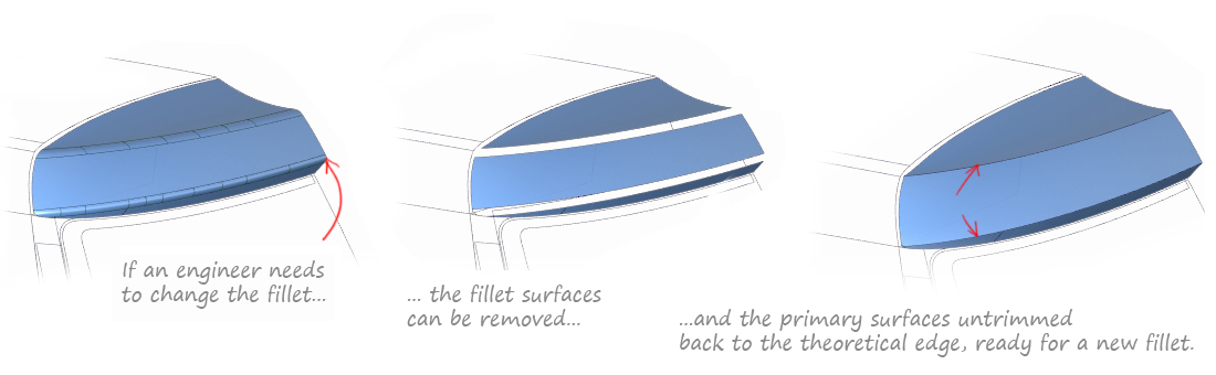 Working to theoreticals provides more flexibility to downstream process. In particular, if an engineer needs to modify a detail fillet, having the original theoretical edges allows them to make modifications.