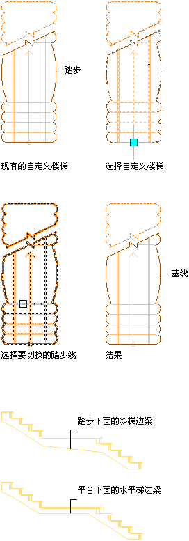使用以下步骤,通过选择线条,可以将现有的自定义梯边梁楼梯走向替换为新的梯边梁楼梯走向。该线条必须位于楼梯内部,才能用于替换梯边梁楼梯走向,而且必须与楼梯的整个长度相吻合。